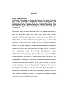 Kurnianigrum, Woro (2006) Peningkatan Pengendalian Diri pada Anak Usia Sekolah yang Mengalami ADHD Tipe Kombinasi melalui Kombinasi Teknik Progressive Delayed Reinforcement dan Kegiatan Pengalih. Masters thesis, Universitas Tarumanagara.