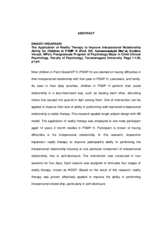 Widarsari, Dinasti (2006) "PENINGKATAN KEMAMPUAN MENJALIN HUBUNGAN INTERPERSONAL PADA ANAK PENGHUNI PSMP H MELALUI TERAPI REALITAS ". Masters thesis, Universitas Tarumanagara.