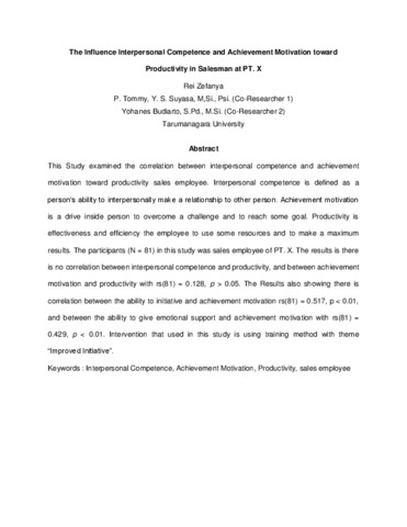 This Study examined the correlation between interpersonal competence and achievement motivation toward productivity sales employee. Interpersonal competence is defined as a person’s ability to interpersonally make a relationship to other person. Achievement motivation is a drive inside person to overcome a challenge and to reach some goal. Productivity is effectiveness and efficiency the employee to use some resources and to make a maximum results. The participants (N = 81) in this study was sales employee of PT. X. The results is there is no correlation between interpersonal competence and productivity, and between achievement motivation and productivity with rs(81) = 0.128, p > 0.05. The Results also showing there is correlation between the ability to initiative and achievement motivation rs(81) = 0.517, p < 0.01, and between the ability to give emotional support and achievement motivation with rs(81) = 0.429, p < 0.01. Intervention that used in this study is using training method with theme “Improved Initiative”.