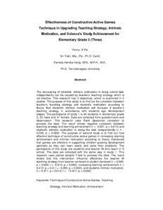 The decreasing of students' intrinsic motivation in doing school task independently can be caused by teacher's teaching strategy which is not effective. This research has 3 objectives, which is examined in 2 studies. The purpose of first study is to find out the corelation between teacher's teaching strategy and student's motivation according to theory that student's intrinsic motivation will increase if teacher's teaching strategy in accordance with students age development stages. The participants of study 1 is 64 students in elementary grade 3, 23 male and 41 female. Data are collected from questionnaire and observation. This research uses Rank Spearman correlation to process the data. The results shows negative correlative between teaching strategy and learning achievement (r = -0,307, p = 0,014) and student's intrinsic motivation in doing the task independently (r = -0,539, p = 0,000). The purpose of second study is to find out how effective technique of constructive - active games in increasing learning achievement and intrinsic motivation according to theory mentioned that games are effective in supporting children growing development optimally so they can learn easily and solve their problems. The participants of this study are students and teacher M who teach in X school. The data are collected with the same way in study 1. This research uses paired sample T-test to process the data. The result shows that this intervention influence effectively the teacher M teaching strategy from teacher centered to student centered (r= 0,590; p= 0,000; t= -6,815, p=0,000), increasing learning achievement (r= 0,412; p= 0,0; t= -3,293; p=0,002), and students intrinsic motivation (r= 0,311; p= 0,013; t= -14,917; p= 0,000).