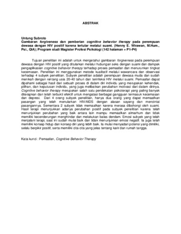 Subroto, Untung (2010) Forgiveness dan Pemberian Cognitive Behavior Therapy pada Perempuan Dewasa dengan HIV Positive karena tertular Suami. Masters thesis, Universitas Tarumanagara.