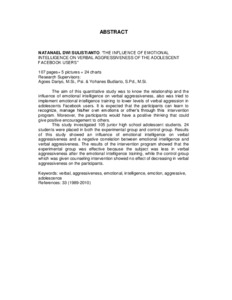 "The aim of this quantitative study was to know the relationship and the influence of emotional intelligence on verbal aggressiveness, also was tried to implement emotional intelligence training to lower levels of verbal aggression in adolescents Facebook users. It is expected that the participants can learn to recognize, manage his/her own emotions or other’s through this intervention program. Moreover, the participants would have a positive thinking that could give positive encouragement to others.