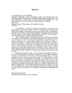 This Research is aimed at knowing the description of social skill and implementation of social skill training in the effort of improving social skill of autism patient late-teenagers. This research is split into two studies: Study 1, describes the description of social skill of autism patient teenagers. The said social skill is referred from the theory of social program called TEACCH (Treatment and education of autistic and related communication handicapped children). Study 1 applies qualitative research design with the method of case study. The subjects of this research are four people, consisting of two couples of mother and a child with autism. The technique incorporated for subject extraction is purposive sampling, i.e., a sample taken based on other than stratum, random or place of origin. Rather, it is based on the characteristics of the subject. This study 1 results in a description of social skill of the subject called DN, who obtains good stimulus from his social environment, and a description of social skill of a subject named SL who gets less social stimulus. The finding of Study 1 depicts that an autism patient who gets good social stimulus from his/her social environment would have better social skill compared to another autism patient who gets less social stimulus. Based on the finding of study 1, an intervention is then applied (study 2) in the form of implementation of social skill training for the autism patient companion. The subject in this Study 2 is the mother of the second subject (SL). SL is a lateteenager with autism who gets less social stimulus. The implementation of social skill training refers to the application of knowledge on social skill for the autism patient and similarity model (social learning theory, Bandura, 1997). Moreover, the researcher also gives homework to the mother of SL using the method of behavioral modification with positive reinforcement. Further, SL’s mother is directed to be the agent of change for SL. From the pre-test and post-test results of Study 2 it is found that the implementation of social skill training can be said as successful along with the improvement of knowledge of SL’s mother on the social skill of teenagers with autism.