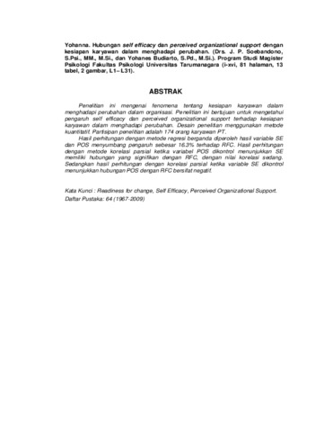 Yohanna, Yohanna (2009) Hubungan Self-Efficacy dan Perceived Organizational Support dengan Kesiapan Karyawan dalam Menghadapi Perubahan (Studi Kasus pada PT. H, Cipanas). Masters thesis, Universitas Tarumanagara.