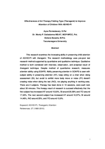 This research examines the increasing ability in preserving child attention of AD/HD-PI with theragami. The research methodology uses pre-post test research method supported by quantitative and qualitative technique. Qualitative method is both correlated with interview, observation, and analytical result of theragami technique. Despite method of quantitative research, measures attention ability using SOAPS. Ability preserving attention in SOAPS is seen with subject ability in preserving attention (AT), keep sitting on a chair when doing assessment (SI), but avoid to exhibit more body move or noise (/FI) doesn’t creating noise when doing the test (/NO), nor playing anything in working area. There are 2 subjects. Therapy has been done in 10 sessions, were each took about 30 minutes. The therapy result of research is succeed effectively that the first subject has increased AT around 15,02%, SI around 20,58% and /TO around 17,42%. The next second subject has increased AT around 10,57%; SI around 14,46%, /NO around 25%, and /TO around 13,8%.
