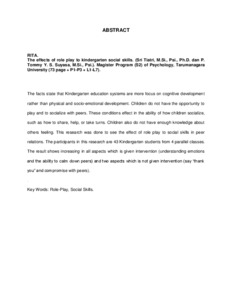 The facts state that Kindergarten education systems are more focus on cognitive development rather than physical and socio-emotional development. Children do not have the opportunity to play and to socialize with peers. These conditions effect in the ability of how children socialize, such as how to share, help, or take turns. Children also do not have enough knowledge about others feeling. This research was done to see the effect of role play to social skills in peer relations. The participants in this research are 43 Kindergarten students from 4 parallel classes. The result shows increasing in all aspects which is given intervention (understanding emotions and the ability to calm down peers) and two aspects which is not given intervention (say “thank you” and compromise with peers).