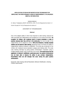 One of the adaptive ability of which most important is toilet training, because the skills associated with independence and acceptance in the social environment. No exception for children with moderate levels of mental retardation or able to practice, because later they will live in the community. So must be able to live independently and not depend on others. With all its limitations, mentally retarded children can be trained to toilet training. Appropriate ways to enhance the ability of independently toileting is behavior modification. The study was conducted on two children with moderate mental retardation category bad toileting skills. This study uses chaining technique by giving positive reinforcement. Evaluation using a multiple baseline design study conducted at the school. The results prove that the application of behavior modification, particularly given the positive reinforcement has not been able to improve the ability to pee (urinate) independently. Nevertheless there are still changes that occur during the given positive reinforcement