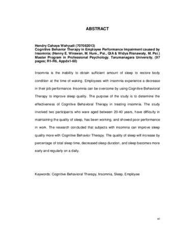 Cahaya, Hendry (2011) Cognitive Behavioral Therapy (CBT) pada karyawan yang mengalami insomnia. Masters thesis, Universitas Tarumanagara.