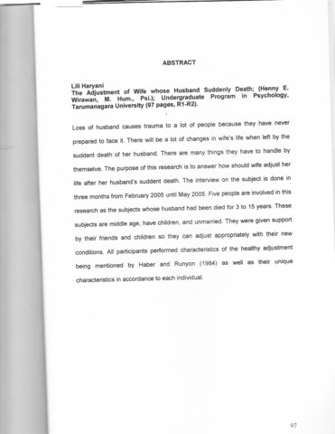 Loss of husband causes trauma to a lot of people because they have never prepared to face it. There will be a lot of changes in wife's life when left by the suddent death of her husband. There are many things they have to handle by themselve. The purpose of this research is to answer how should wife adjust her life after her husband's suddent death. The interview on the subiect is done in three months from February 2005 until May 2005. Five people are involved in this i research as the subjects whose husband had been died for 3 to 15 years, These subjects are middle age, have children, and unmarried. They were given support by their friends and children so they can adjust appropriately with their new conditions. All participants performed characteristics of the healthy adjustment being mentioned by Haber and Runyon (1984) as well as their unique characteristics in accordance to each individual.