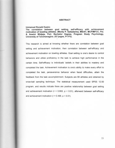 Kastro, Immanuel Ronald (2006) Hubungan penetapan sasaran dan self-efficacy dengan motivasi berprestasi atlet Bowling. Skripsi thesis, Universitas Tarumanagara.