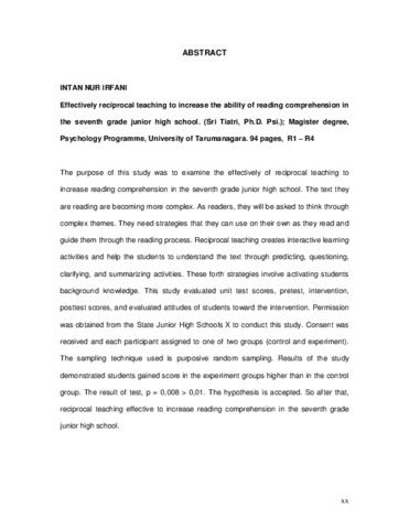 I, Intan Nur (2011) Efektivitas intervensi reciprocal teaching terhadap pemahaman bacaan (Studi pada peserta didik SMPN X kelas VII di Kota Cirebon). Masters thesis, Universitas Tarumanagara.