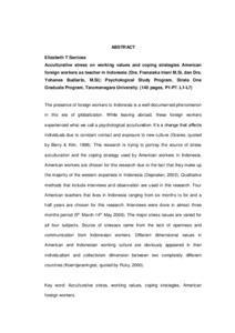 Santosa, Elizabeth T. (2006) Stress akulturasi karena budaya kerja dan strategi coping tenaga kerja asing Amerika yang bekerja sebagai guru di Indonesia. Skripsi thesis, Universitas Tarumanagara.