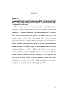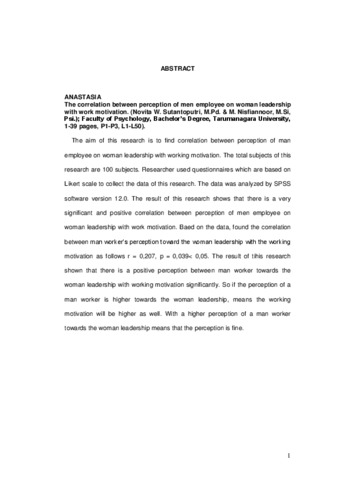 " The aim of this research is to find correlation between perception of man employee on woman leadership with working motivation. The total subjects of this research are 100 subjects. Researcher used questionnaires which are based on Likert scale to collect the data of this research. The data was analyzed by SPSS software version 12.0. The result of this research shows that there is a very significant and positive correlation between perception of men employee on woman leadership with work motivation. Baed on the data, found the correlation between man worker’s perception toward the woman leadership with the working motivation as follows r = 0,207, p = 0,039< 0,05. The result of tihis research shown that there is a positive perception between man worker towards the woman leadership with working motivation significantly. So if the perception of a man worker is higher towards the woman leadership, means the working motivation will be higher as well. With a higher perception of a man worker towards the woman leadership means that the perception is fine.