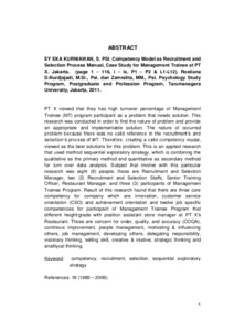 PT X viewed that they has high turnover percentage of Management Trainee (MT) program participant as a problem that needs solution. This research was conducted in order to find the nature of problem and provide an appropriate and implementable solution. The nature of occurred problem because there was no valid reference in the recruitment’s and selection’s process of MT. Therefore, creating a valid competency model, viewed as the best solutions for this problem. This is an applied research that used method sequential exploratory strategy, which is combining the qualitative as the primary method and quantitative as secondary method for turn over data analysis. Subject that involve with this particular research was eight (8) people, those are Recruitment and Selection Manager, two (2) Recruitment and Selection Staffs, Senior Training Officer, Restaurant Manager, and three (3) participants of Management Trainee Program. Result of this research found that there are three core competency for company which are innovation, customer service orientation (CSO) and achievement orientation and twelve job specific competencies for participant of Management Trainee Program that different height/grade with position assistant store manager at PT X’s Restaurant. Those are concern for order, quality, and accuracy (COQA), continous improvement, people management, motivating & influencing others, job management, developing others, delegating responsibility, visionary thinking, selling skill, creative & iniative, strategic thinking and analitycal thinking.