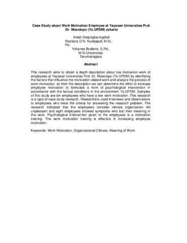 This research aims to obtain a depth description about low motivation work of employees at Yayasan Universitas Prof. Dr. Moestopo (Ys.UPDM) by identifying the factors that influence the motivation-related work and analyze the process of work motivation, so from the description we can determine the effort to increase employee motivation to formulate a form of psychological intervention in accordance with the factual conditions in the environment Ys.UPDM. Samples of this study are ten employees who have a low work motivation. This research is a type of case study research. Researchers used interviews and observations to employees who meet the criteria for answering the research problem. The research indicated that the employees consider climate organization felt unpleasant and eight employees showed symptoms who lost their meaning in the work. Psychological intervention given to the employees is a motivation training. The work motivation training is effective in increasing employee motivation