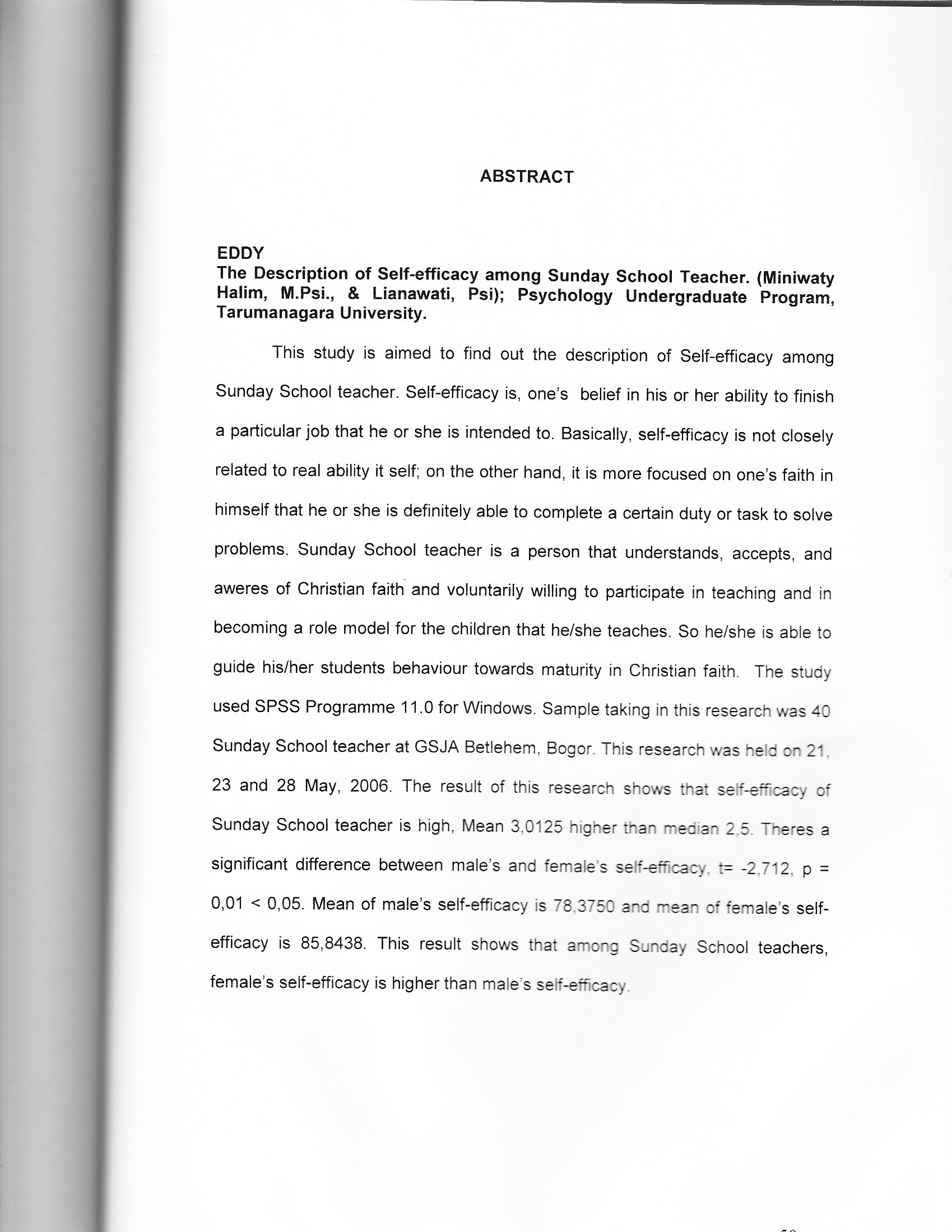 This study is aimed to find out the description of Seif-efficacy among Sunday School teacher. Self-efficacy is, one's belief in his or her ability to finish a particular job that he or she is intended to. Basically, self-efficacy is not closely t related to real ability it self; on the other hand, it is more focused on one's faith in ih , himself that he or she is definitely able to complete a certain duty or task to solve problems. Sunday School teacher is a person that understands, accepts, and . aweres of Christian faith. and voluntarily willing to participate in teaching and in becoming a role model for the children that he/she teaches. So he/she is able to guide his/her students behaviour towards maturity in Christian faith. The study used SPSS Programme 11.0 for Windows. Sample taking in this research was 40 Sunday School teacher at GSJA Betlehem, Bogor. This research was held on 21. 23 and 28 May, 2006. The result of this research shows that seif-efficacy of Sunday School teacher is high, Mean 3,0125 higher than median 2.5. Theres a significant difference between males and female's self-efficacy. ”t: 2712, p 0,01 < 0,05. Mean of male's self-efficacy is 78.3750 and mean of females self- efficacy is 85,8438. This result shows that among Sunday School teachers, female's self-efficacy is higher than maie's self-efficacy-
