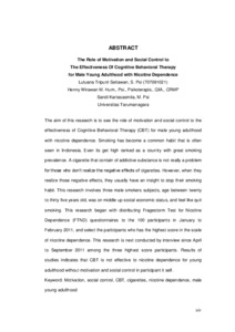 The aim of this research is to see the role of motivation and social control to the effectiveness of Cognitive Behavioral Therapy (CBT) for male young adulthood with nicotine dependence. Smoking has become a common habit that is often seen in Indonesia. Even its get high ranked as a country with great smoking prevalence. A cigarette that contain of addictive substance is not really a problem for those who don’t realize the negative effects of cigarettes. However, when they realize those negative effects, they usually have an insight to stop their smoking habit. This research involves three male smokers subjects, age between twenty to thirty five years old, was on middle up social economic status, and feel like quit smoking. This research began with distributing Fragestorm Test for Nicotine Dependence (FTND) questionnaires to the 100 participants in January to February 2011, and select the participants who has the highest score in the scale of nicotine dependence. This research is next conducted by interview since April to September 2011 among the three highest score participants. Results of studies indicates that CBT is not effective to nicotine dependence for young adulthood without motivation and social control in participant it self.