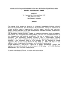 The dimensions of work motivation, namely the need for achievement, work with passion, activity better, love to compete, hard-working, diligent in his work. The performance consists of core competencies and functional competence. This type of research is a method of quantitative, non experiments. Sampling techniques using a nonprobability sampling techniques. The number of subjects of study that is 42 employees part sales assistant at boutique X. Data processing using the SPSS program 18.0 and analyzed by multiple regression. The research results obtained F (42) =4,521 p = 0,017<0,05. So there are significant effects of organizational climate and work motivation on performance.
