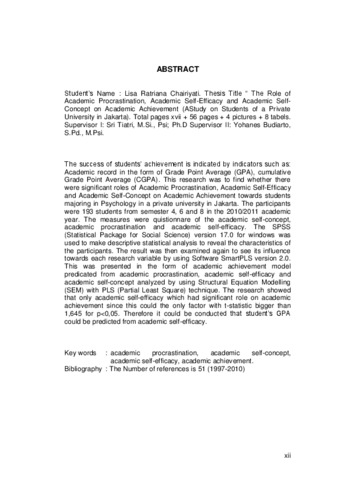 Ratriana Chairiyati, Lisa (2012) Peran prokrastinasi akademik, self-efficacy akademik dan konsep diri akademik terhadap prestasi akademik (Studi pada mahasiswa sebuah Universitas Swasta di Jakarta). Masters thesis, Universitas Tarumanagara.