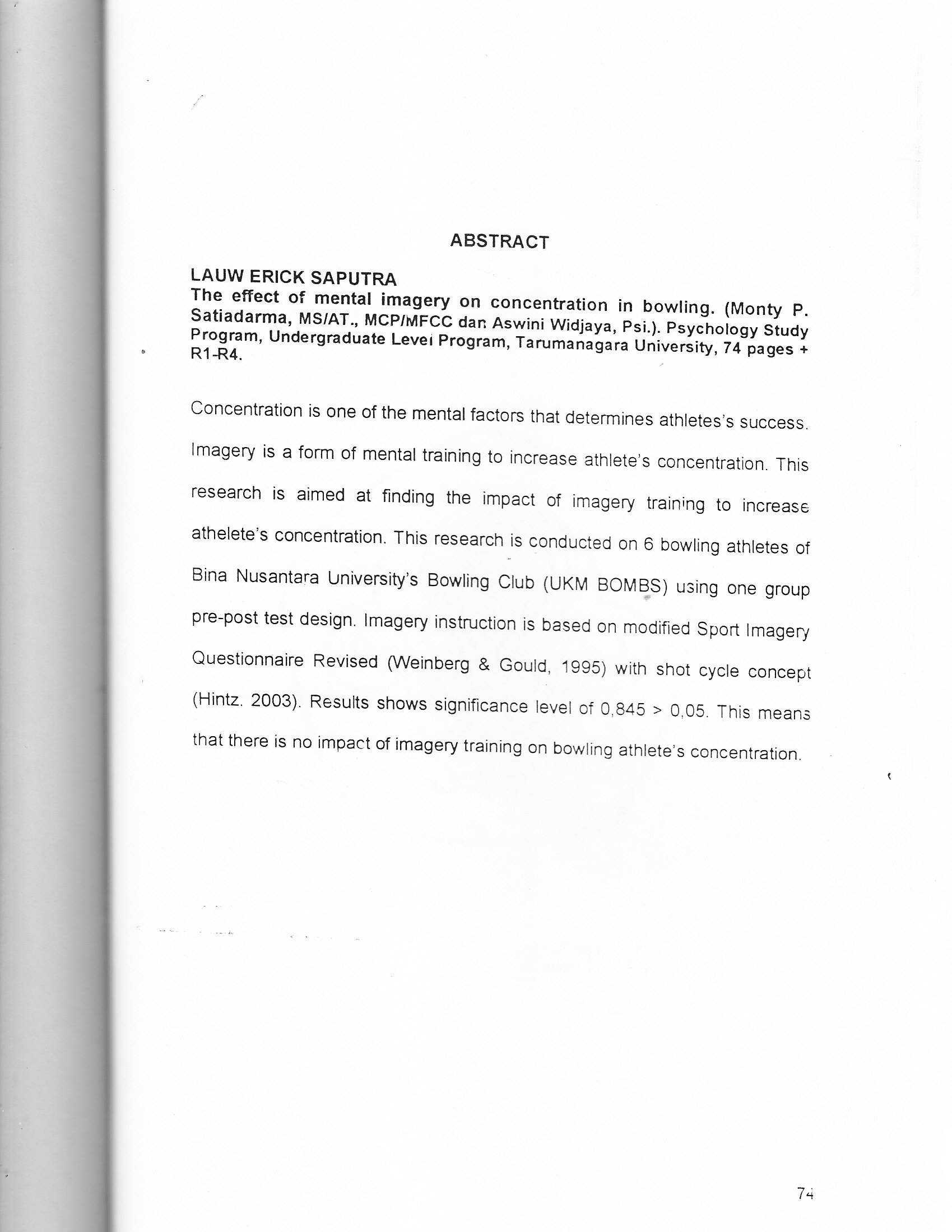 "Concentration is one of the mental factors that determines athletes's success. Imagery is a form of mental training to increase athlete's concentration. This research is aimed at finding the impact of imagery training to increase athelete's concentration. This research is conducted on 6 bowling athletes of Bina Nusantara University's Bowling Club (UKM BOMB_S) using one group pre-post test design. Imagery instruction is based on modified Sport Imagery Questionnaire Revised (Weinberg & Gould, 1995) with shot cycle concept (Hintz. 2003). Results shows signiticance level of 0,845 > 0,05. This means that there is no impact of imagery training on bowling athlete's concentration.