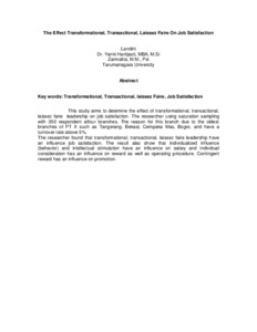 This study aimed to detemine the effect of transformational, transactional, laissez faire leadership on job satisfaction. The researcher using purposive sampling was used and 350 respondents were gathered from four branches which had turnover rate above 5%. Result showed that transformational, transactional, laissez faire leadership had an influence job satisfaction. The result also showed that individualized influence (behavior) and intellectual stimulation had an influence on salary and individual consideration had an influence on reward as well as operating procedure. Contingent reward had an influence on promotion.