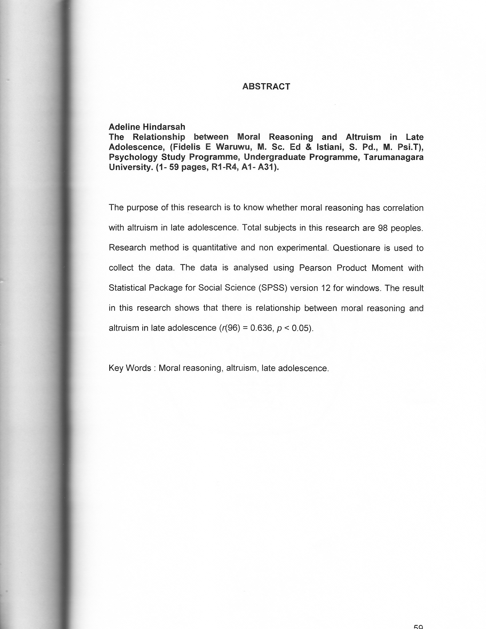 Hindarsah, Adeline (2006) Hubungan antara penalaran moral perilaku altruisme pada remaja akhir. Skripsi thesis, Universitas Tarumanagara.