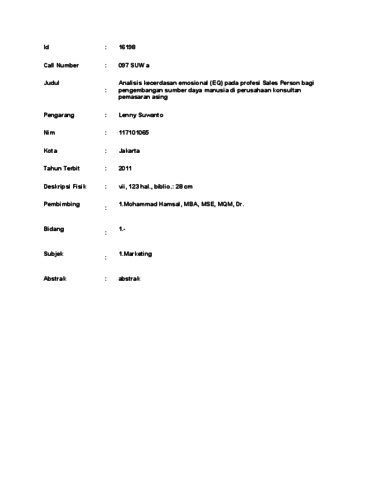 Suwanto, Lenny (2011) Analisis kecerdasan emosional (EQ) pada profesi Sales Person bagi pengembangan sumber daya manusia di perusahaan konsultan pemasaran asing. Masters thesis, UNIVERSITAS TARUMANAGARA.