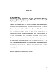 The aims of this research is to find the difference of level assertiveness based on leadership style to the middle manager. Leadership style refers to style of leadership that carried by leader to influenced their worker (Wursanto, 2003). Assertiveness is traits that showed honestly to express and open for their needs, feelings, and thoughts without hurting anyone (Rathus & Nevid, 1980). The participant for this research on 21st-25th May 2007 consisted from 100 middle manager company. Researcher used questionnaire which based on Likert scale and processed with SPSS software ver 12.0. Using One Way Anova, the result is F = 2.689 and ρ = .000 < .05. This result showed that there’s a difference of level assertiveness based on leadership style. So, there was a difference of level assertiveness based on leadership style..