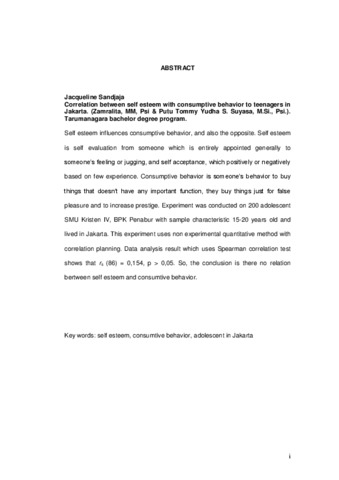 Jaqueline, Jaqueline (2007) Hubungan antara self esteem dan perilaku konsumtif. Studi pada remaja di Jakarta. Skripsi thesis, Universitas Tarumanagara.