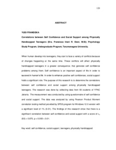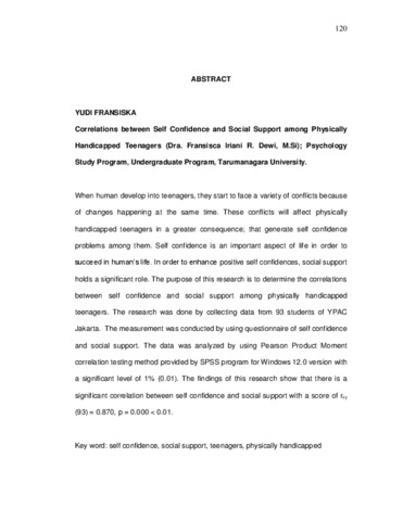 Fransiska, Yudi (2006) Hubungan antara kepercayaan diri dan dukungan sosial pada remaja tuna daksa. Skripsi thesis, Universitas Tarumanagara.