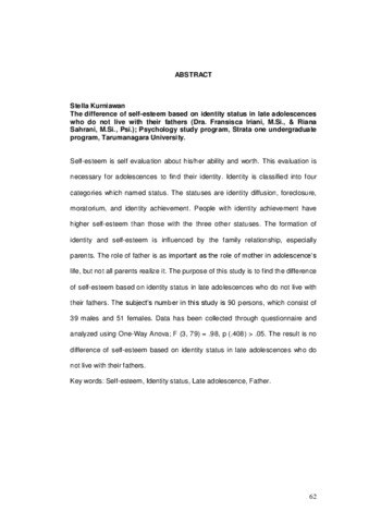 Kurniawan, Stella (2007) Perbedaan self esteem berdasarkan status identitas pada remaja akhir yang tidak tinggal bersama ayah. Skripsi thesis, Universitas Tarumanagara.
