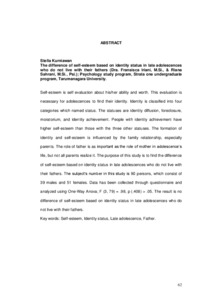 Self-esteem is self evaluation about his/her ability and worth. This evaluation is necessary for adolescences to find their identity. Identity is classified into four categories which named status. The statuses are identity diffusion, foreclosure, moratorium, and identity achievement. People with identity achievement have higher self-esteem than those with the three other statuses. The formation of identity and self-esteem is influenced by the family relationship, especially parents. The role of father is as important as the role of mother in adolescence’s life, but not all parents realize it. The purpose of this study is to find the difference of self-esteem based on identity status in late adolescences who do not live with their fathers. The subject’s number in this study is 90 persons, which consist of 39 males and 51 females. Data has been collected through questionnaire and analyzed using One-Way Anova; F (3, 79) = .98, p (.408) > .05. The result is no difference of self-esteem based on identity status in late adolescences who do not live with their fathers.