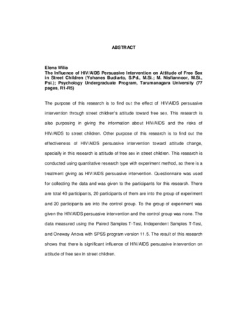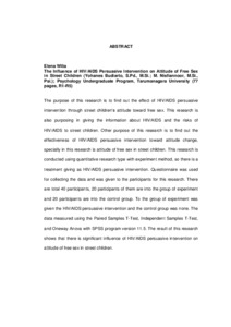 The purpose of this research is to find out the effect of HIV/AIDS persuasive intervention through street children’s attitude toward free sex. This research is also purposing in giving the information about HIV/AIDS and the risks of HIV/AIDS to street children. Other purpose of this research is to find out the effectiveness of HIV/AIDS persuasive intervention toward attitude change, specially in this research is attitude of free sex in street children. This research is conducted using quantitative research type with experiment method, so there is a treatment giving as HIV/AIDS persuasive intervention. Questionnaire was used for collecting the data and was given to the participants for this research. There are total 40 participants, 20 participants of them are into the group of experiment and 20 participants are into the control group. To the group of experiment was given the HIV/AIDS persuasive intervention and the control group was none. The data measured using the Paired Samples T-Test, Independent Samples T-Test, and Oneway Anova with SPSS program version 11.5. The result of this research shows that there is significant influence of HIV/AIDS persuasive intervention on attitude of free sex in street children.