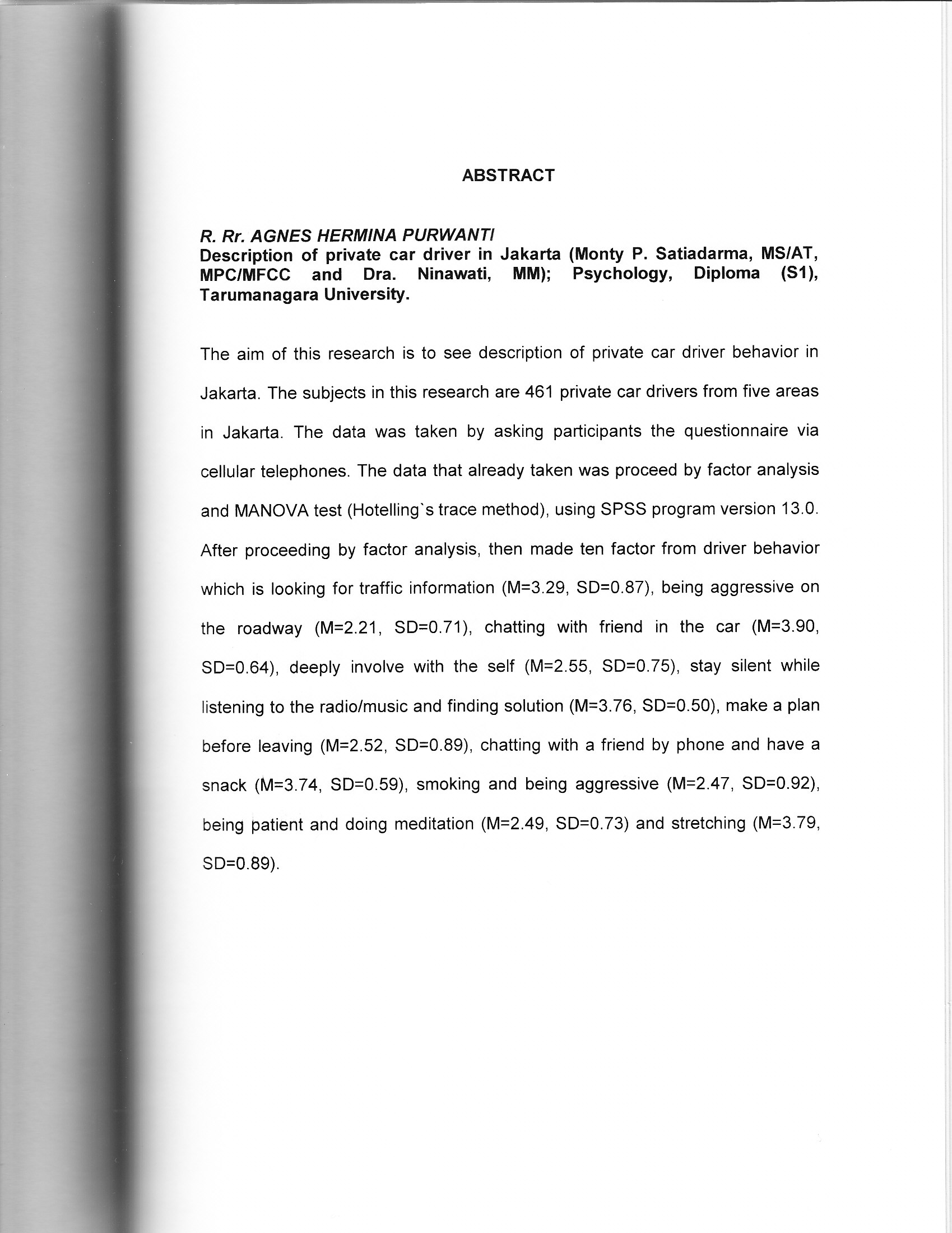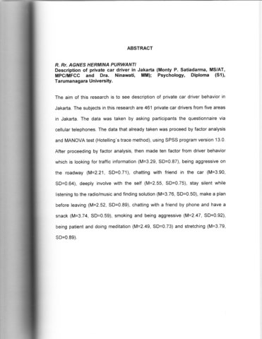P, R.Rr. Agnes H. (2007) Gambaran perilaku pengemudi mobil pribadi di Jakarta. Skripsi thesis, Universitas Tarumanagara.