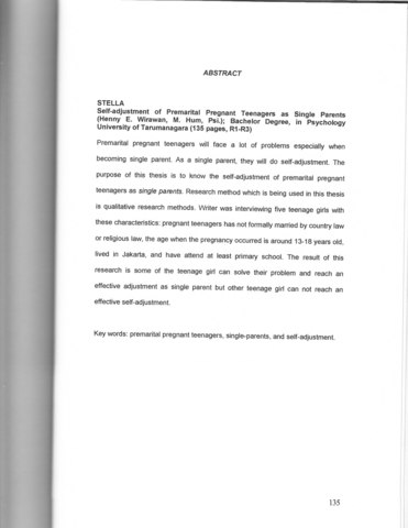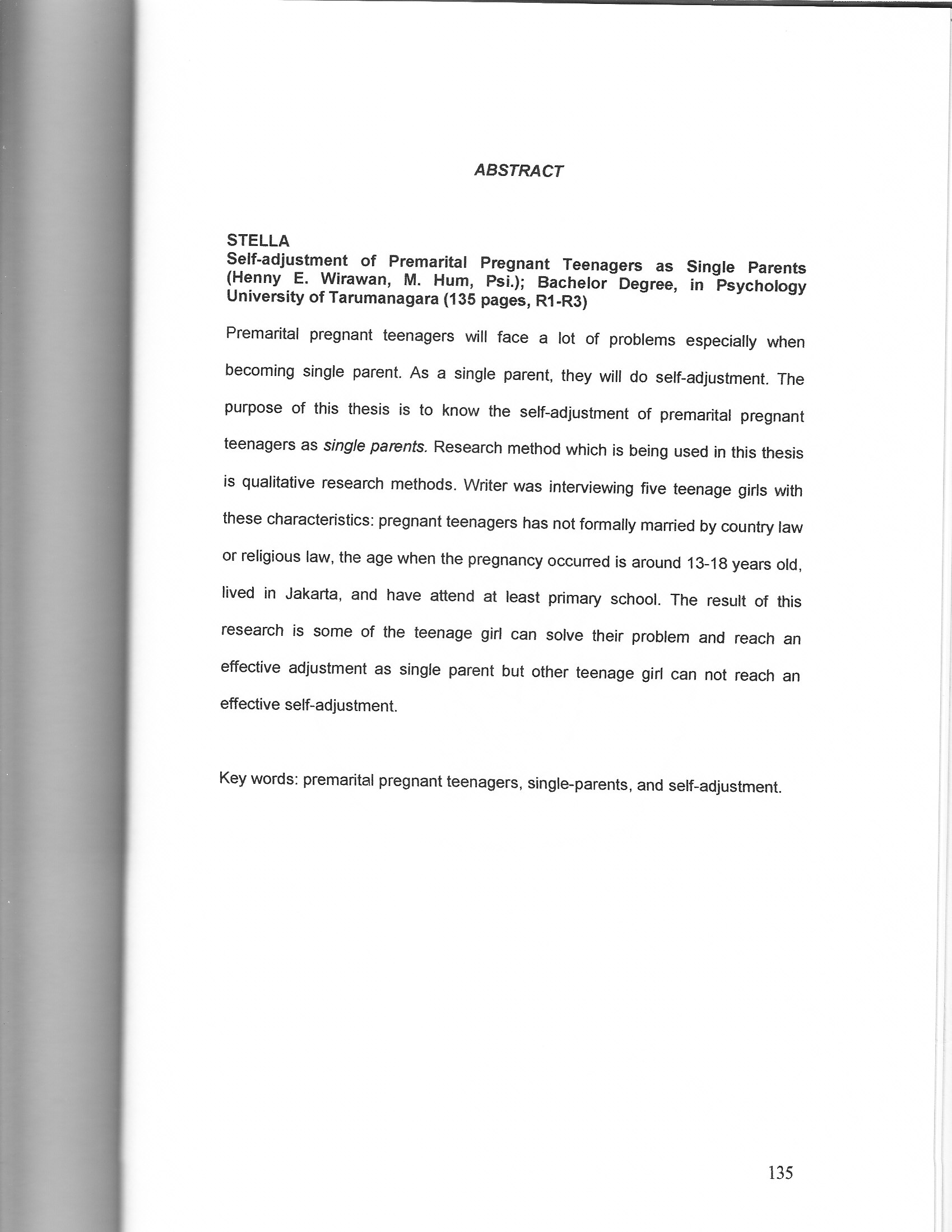 Stella, Stella (2007) Penyesuaian diri remaja perempuan yan hamil pranikah sebagai single parent. Skripsi thesis, Universitas Tarumanagara.