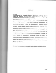 Premarital pregnant teenagers will face a lot of problems especially when becoming single parent. As a single parent, they will do self-adjustment. The purpose of this thesis is to know the self-adjustment of premarital pregnant teenagers as single parents. Research method which is being used in this thesis is qualitative research methods. Writer was interviewing five teenage girls with these characteristics: pregnant teenagers has not formally married by country law or religious law, the age when the pregnancy occurred is around 13-18 years old, lived in Jakarta, and have attend at least primary school. The result of this research is some of the teenage girl can solve their problem and reach an effective adjustment as single parent but other teenage girl can not reach an effective self-adjustment.
