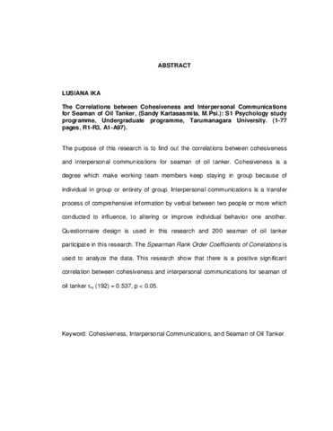 The purpose of this research is to find out the correlations between cohesiveness and interpersonal communications for seaman of oil tanker. Cohesiveness is a degree which make working team members keep staying in group because of individual in group or entirety of group. Interpersonal communications is a transfer process of comprehensive information by verbal between two people or more which conducted to influence, to altering or improve individual behavior one another. Questionnaire design is used in this research and 200 seaman of oil tanker participate in this research. The Spearman Rank Order Coefficients of Correlations is used to analyze the data. This research show that there is a positive significant correlation between cohesiveness and interpersonal communications for seaman of oil tanker rxy (192) = 0.537, p < 0.05.