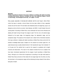 Many people, especially in Indonesia still unfamiliar with the word “lupus”. Little of them notice that lupus is actually a chronic illness that has taken millions of lives, especially women all over the world. If it’s not taken care intensively since the beginning, lupus is as dangerous and as chronic as cancer, heart disease, and AIDS. It could threaten lives and causing death. According to Kübler-Ross, every individuals that have chronic illnesses and dealing with death will get through five stages of grief. The first one is the denial stage, followed by the anger stage, the bargaining stage, the depression stage, and the acceptance stage. The purpose of this research are to obtain forms of emotional reactions from lupus sufferers in dealing with death according to Kübler-Ross theory and enrich the society’s knowledge about lupus. Subjects for this research are woman aged 20 to 40 years because lupus usually attacked woman in their reproduction age, that is between 15 to 45 years old. The method that is used for this research is qualitative with in-depth interview and observation. The result of this research showed that the six subjects that have been interviewed experienced the five stages of grief according to Kübler-Ross theory. Although a lot of them did not experience it according to the right order based on Kübler-Ross theory and some of them dealt with one stage longer than the others, but they all come down to the acceptance stage and live embracing the days ahead of them without being fear of death.