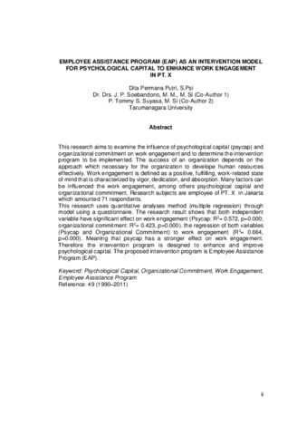 Permana Putri, Dita (2012) Employee assistance program (EAP) sebagai intervensi terhadap psychological capital untuk meningkatkan work engagement di PT X. Masters thesis, Universitas Tarumanagara.