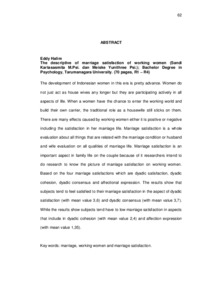 The development of Indonesian women in this era is pretty advance. Women do not just act as house wives any longer but they are participating actively in all aspects of life. When a women have the chance to enter the working world and build their own carrier, the traditional role as a housewife still sticks on them. There are many effects caused by working women either it is positive or negative including the satisfaction in her marriage life. Marriage satisfaction is a whole evaluation about all things that are related with the marriage condition or husband and wife evaluation on all qualities of marriage life. Marriage satisfaction is an important aspect in family life on the couple because of it researchers intend to do research to know the picture of marriage satisfaction on working women. Based on the four marriage satisfactions which are dyadic satisfaction, dyadic cohesion, dyadic consensus and affectional expression. The results show that subjects tend to feel satisfied to their marriage satisfaction in the aspect of dyadic satisfaction (with mean value 3,6) and dyadic consensus (with mean value 3,7). While the results show subjects tend have to low marriage satisfaction in aspects that include in dyadic cohesion (with mean value 2,4) and affection expression (with mean value 1,35).