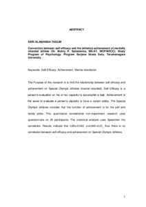 The Purpose of this research is to find the relationship between self efficacy and achievement on Special Olympic athletes (mental retarded). Self Efficacy is a person’s evaluation on his or her capacity to accomplish a task. Achievement is the score to evaluate a person’s capacity to have a certain ability. The Special Olympic athletes consider that the function of achievement is for the self and family pride. This quantitative correlational non-experiment research uses questionnaire on 26 participants. The statistical analysis uses Spearmen rho correlation. Results indicate that r(26)=0.042, ρ=0,840>0,01, thus there is no correlation between self efficacy and achievement on Special Olympic athletes.