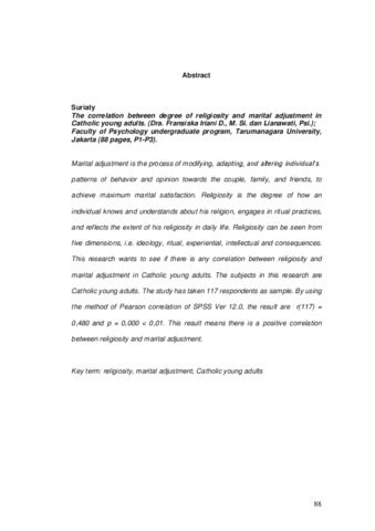 patterns of behavior and opinion towards the couple, family, and friends, to achieve maximum marital satisfaction. Religiosity is the degree of how an individual knows and understands about his religion, engages in ritual practices, and reflects the extent of his religiosity in daily life. Religiosity can be seen from five dimensions, i.e. ideology, ritual, experiential, intellectual and consequences. This research wants to see if there is any correlation between religiosity and marital adjustment in Catholic young adults. The subjects in this research are Catholic young adults. The study has taken 117 respondents as sample. By using the method of Pearson correlation of SPSS Ver 12.0, the result are r(117) = 0,480 and p = 0,000 < 0,01. This result means there is a positive correlation between religiosity and marital adjustment.