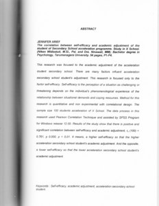 This research was focused to the academic adjustment of the acceleration student secondary school. There are many factors influent acceleration secondary school student's adjustment. This research is focused only to the factor self-efficacy. Self-efficacy is the perception of a situation as challenging or threatening depends on the individual's phenomenological experience of the relationship between situational demands and coping resources. Method for this research is quantitative and non experimental with correlational design. The sample size 100 students acceleration of X School. The data process in this research used Pearson Correlation Technique and assisted by SPSS Program for Windows release 12.00. Results of the study show that there is positive and significant correlation between self-efficacy and academic adjustment, r, (100) = 0,761, p 0,000, p < 0,01. It means, a higher self-efficacy so that the higher acceleration secondary school student's academic adjustment. And the opposite, a lower self-efficacy so that the lower acceleration secondary school student's academic adjustment.