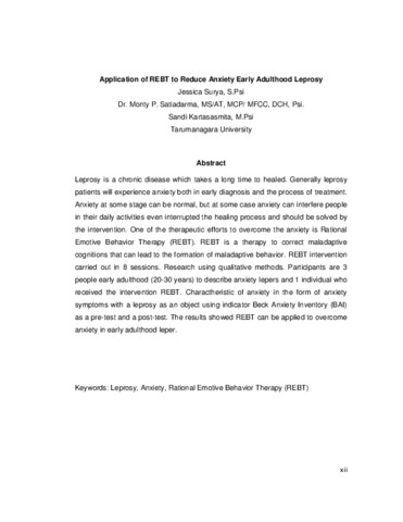 Surya, Jessica (2013) Penerapan REBT untuk mengurangi kecemasan pada individu penderita kusta dewasa awal. Masters thesis, Universitas Tarumanagara.