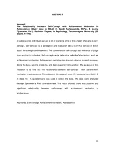 In adolescence, individual can get a lot of changing. One of the unseen changing is self-concept. Self-concept is a perception and evaluation about self that consist of belief about the strength and weakness. The component of self-concept also influence of judge from another to individual. Self-concept can be determine individual’s behaviour, such as achievement motivation. Achievement motivation is a internal stimulus to reach success, doing the best, solving problems, and being superior from another. The purpose of this research is to find out the relationship between self-concept with achievement motivation in adolescence. The subject of this research were 174 students from SMAN 2 in class 10. A questionnaire was used to collect the data. The data were analyzed through Spearman’s Rho correlation test. The result showed there was positive and significant relationship between self-concept with achievement motivation in adolescence.