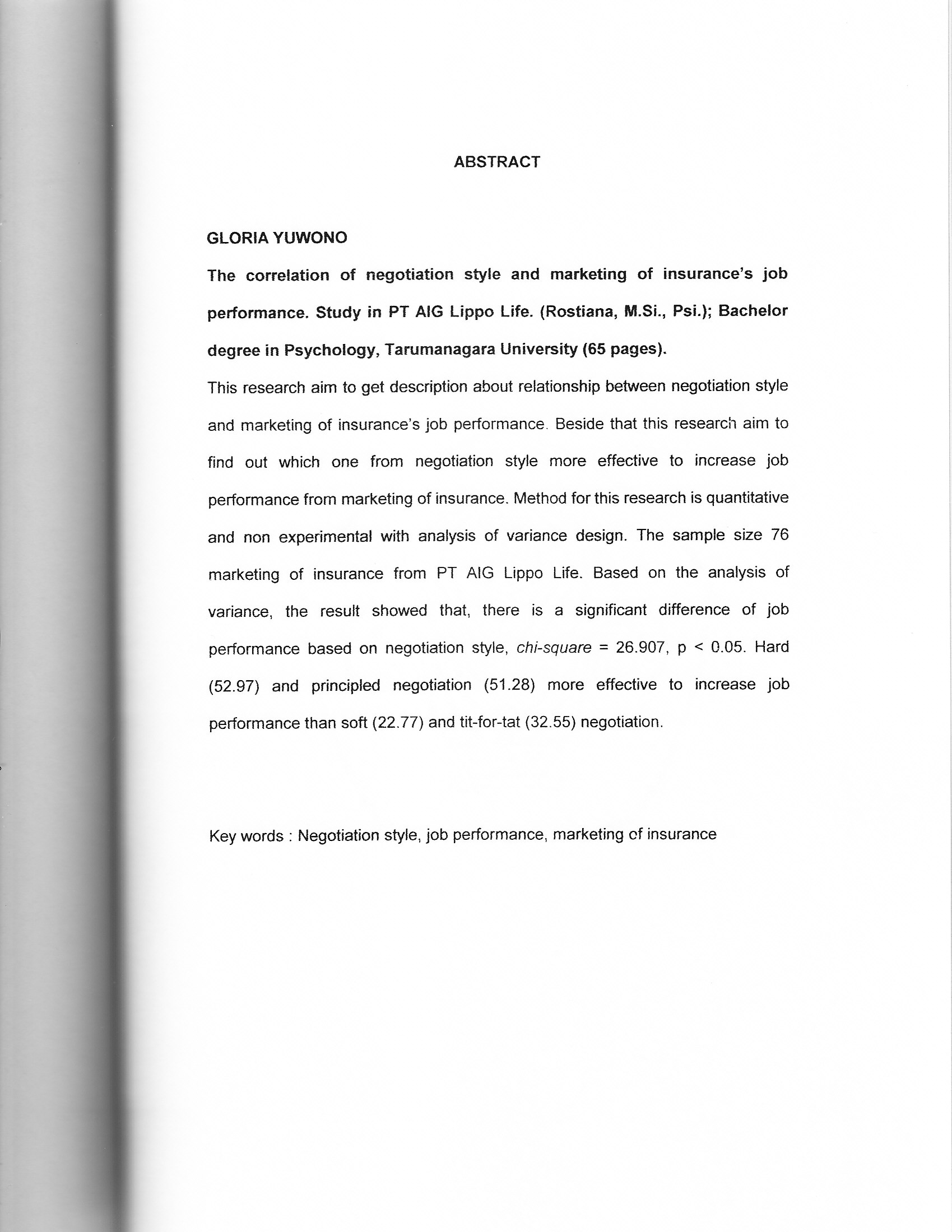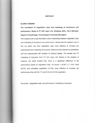 This research aim to get description about relationship between negotiation style and marketing of insurance's job performance. Beside that this research aim to find out which one from negotiation style more effective to increase job performance from marketing of insurance. Method for this research is quantitative and non experimental with analysis of variance design. The sample size 76 marketing of insurance from PT A1G Lippo Life. Based on the analysis of variance, the result showed that, there is a significant difference of job performance based on negotiation style, chi-square = 26.907, p < 0.05. Hard (52.97) and principled negotiation (51.28) more effective to increase job performance than soft (22.77) and tit-for-tat (32.55) negotiation.