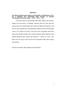 This study purpose to see perception effect about wage to job motivation. Subject this study amount 120 peoples. Collection data from study done with questionnaire with created based Likert Scale and Differential Semantics. Data from this study analyzed with using regression method with assist SPSS program version 13.0. Purpose this study is know what there is perception effect about wage to job motivation. Based result of data processing, gained regression value between perception about wage to job motivation F = 59,002, p = 0.000 < 0,05. Result from this study to refer that there 50,2% perception effect about wage to job motivation.