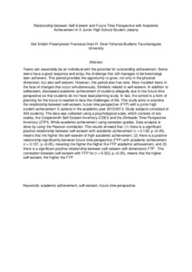 Teens can essentially be an individual with the potential for outstanding achievement. Some teens have a good response and enjoy the challenge that still manages to be berstrategi teen achievers. This period provides the opportunity to grow, not only in the physical dimension, but also self-esteem. However, this period also has risks. Most troubled teens in the face of changes that occur simultaneously. Similarly related to self-esteem. In addition to selfesteem, decreased academic achievement of students allegedly due to low future time perspective so that students do not have lead planning study. In fact, the school is a form of planning for the future is needed to face the challenges of life. This study aims to examine the relationship between self-esteem, future time perspective (FTP) with a junior high student achievement X Jakarta in the academic year 2012/2013. Study subjects consisted of 404 students. The data was collected using a psychological scale, which consists of two scales, the Coopersmith Self-Esteem Inventory (CSEI) and the Zimbardo Time Perspective Inventory (ZTPI). While academic achievement using semester grades. Data analysis is done by using the Pearson correlation. The results showed that: (1) there is a significant positive relationship between self-esteem with academic achievement (r = 0.128, p <0.05), means that the higher the self-esteem of high academic achievement, (2) there is a positive relationship significantly between future time perspective (FTP) with academic achievement (r = 0.157, p <0.05), meaning the higher the higher the FTP academic achievement, and (3) there is a significant positive relationship between self-esteem with dimensions FTP . The correlation between self-esteem with FTP for (r = 0.322, p <0.05), means that the higher self-esteem, the higher the FTP.