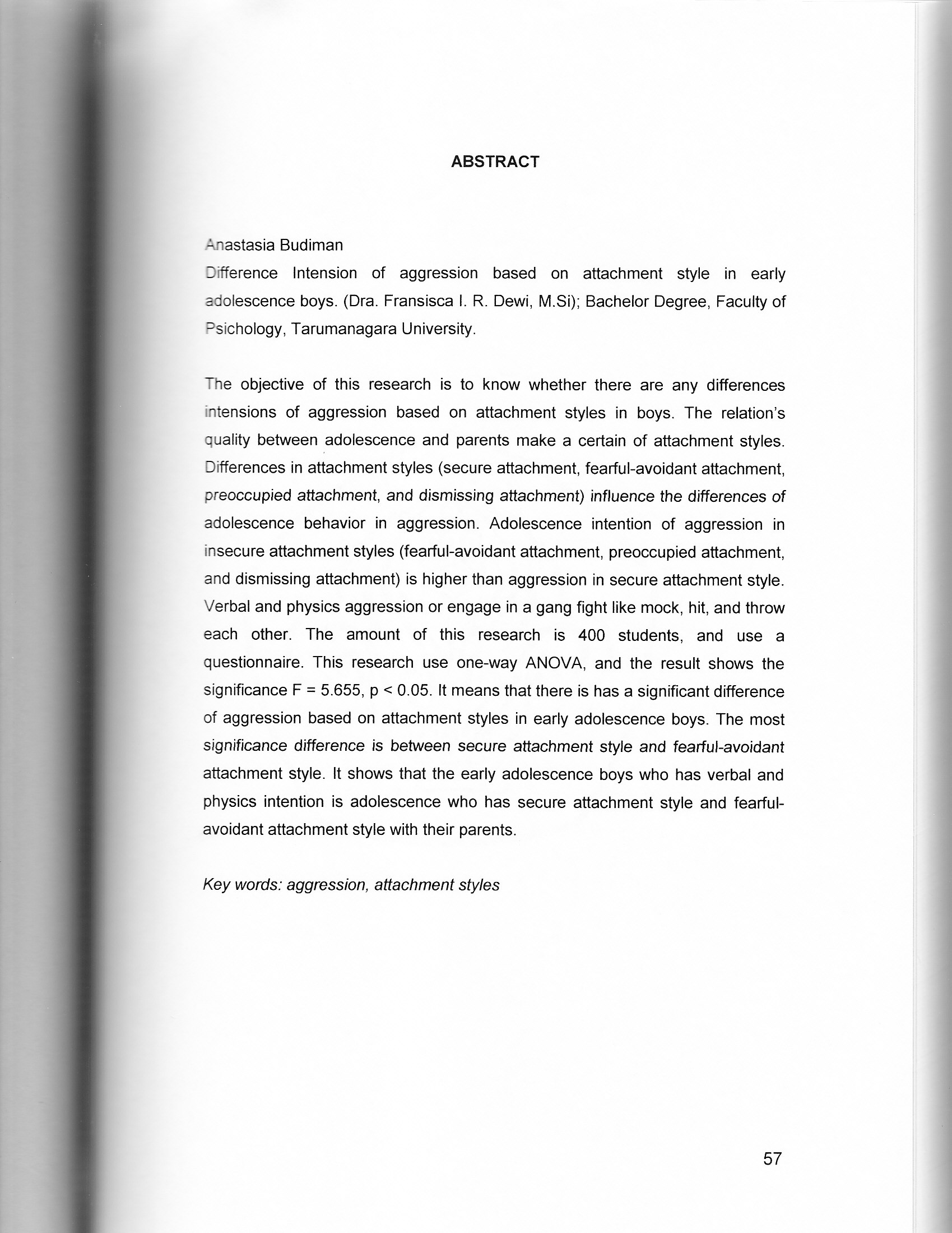 B., Anastasia (2007) Perbedaan intensi agresi remaja awal pria ditinjau dari gaya kelekatan. Skripsi thesis, Universitas Tarumanagara.