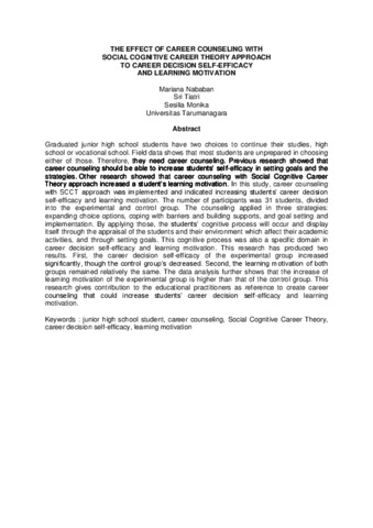 Nababan, Mariana (2013) Pengaruh konseling karir dengan pendekatan social cognitive career theory terhadap career decision self-efficacy dan motivasi belajar (Studi pada siswa SMP X, Jakarta). Masters thesis, Universitas Tarumanagara.